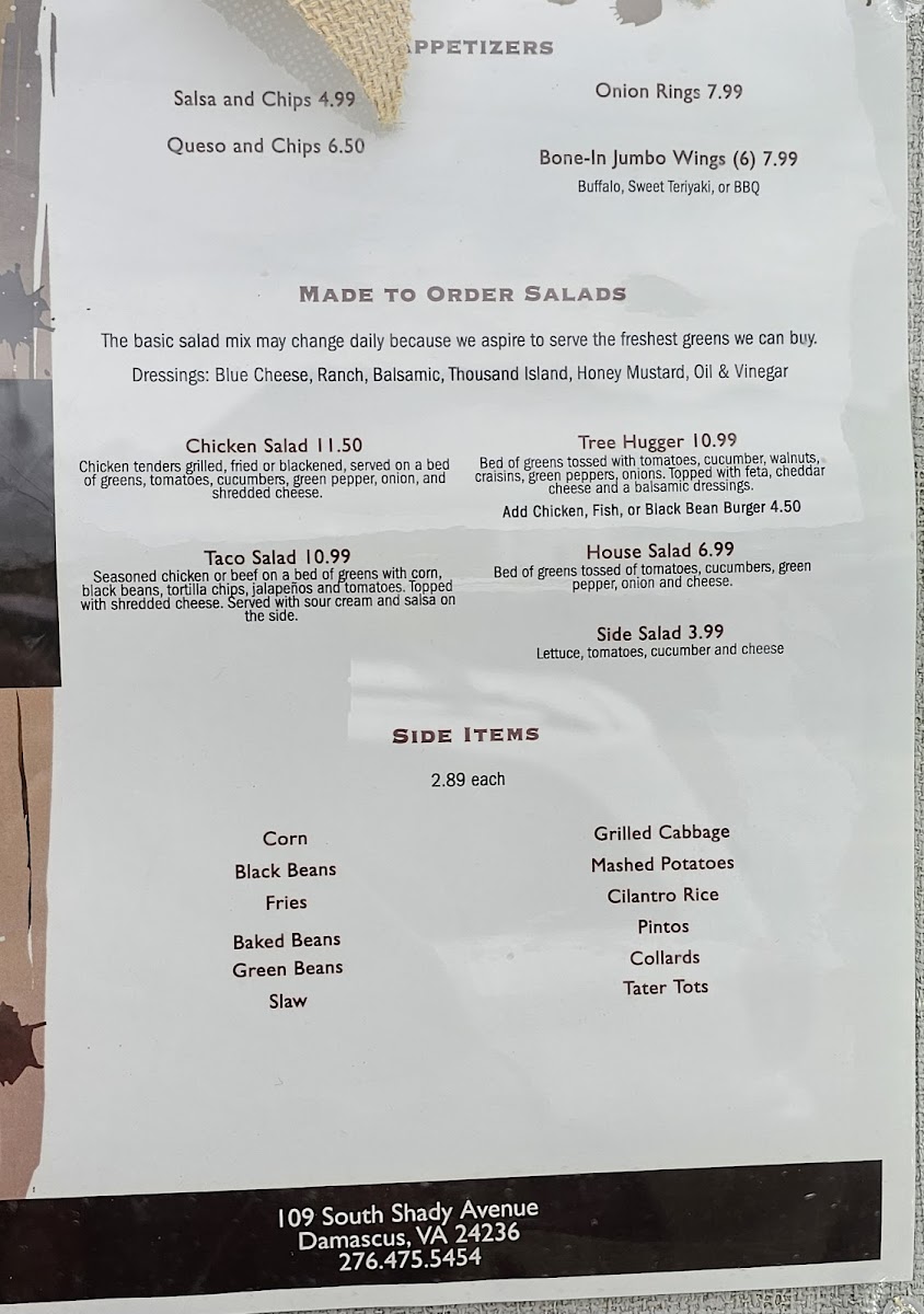 Welcome to Damascus Diner, a charming eatery nestled in the heart of Damascus, VA. Known for its comforting, hearty meals, this diner has quickly become a favorite among locals and travelers alike. The menu boasts an array of delicious options, highlighted by the acclaimed Hillbilly Reuben, a dish that promises to warm you on even the coldest days. Reviews consistently praise this spot for its excellent breakfast burrito, touted as one of the best, making it a must-try for early risers.